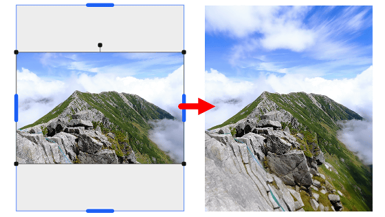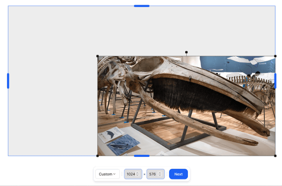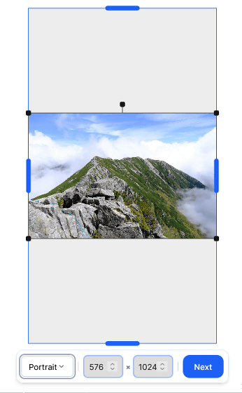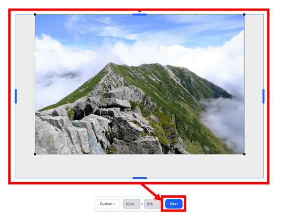 그러면 이미지 편집 도구의 자르기 도구와 같은 화면이 표시됩니다만, 일반 자르기 도구와는 반대로 이미지를 넓히도록 자르기 범위를 지정하고 [Next]를 클릭합니다.