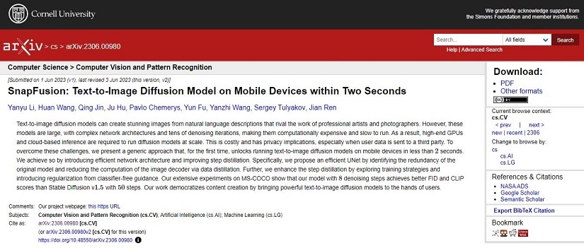 미국의 Snap(스냅챗으로 유명한 메타버스 관련 기업)과 노스 이스턴 대학의 연구자 팀은 논문을 발표하고, 모바일 장치에서 텍스트로 2초 이내에 이미지를 생성하는 새로운 확산 모델 'SnapFusion'을 제안했습니다.