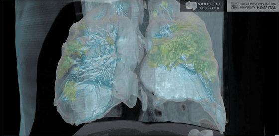이 VR 영상의 기반이 되는 환자는 고혈압 경향이 있지만 평소 건강하던 59세의 남성입니다. 촬영 며칠 전까지만 해도 무증상이었지만, 촬영 시에는 노란색으로 착색된 손상부가 폐를 침식하고 있습니다.