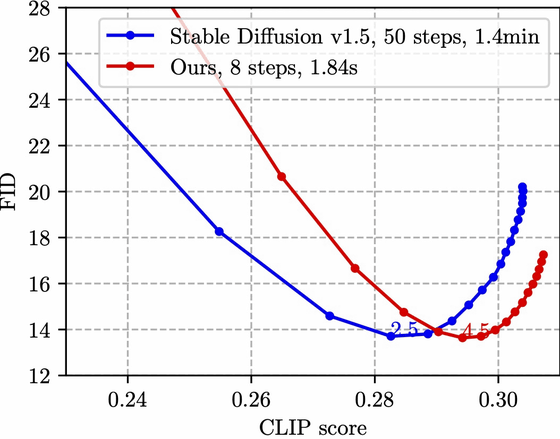 실제로, SnapFusion에 의한 8 스텝 설정에서의 생성(붉은색)과 Stable Diffusion 버전 1.5의 50 스텝 설정에서의 생성(파란색)을 비교한 그래프가 아래입니다.