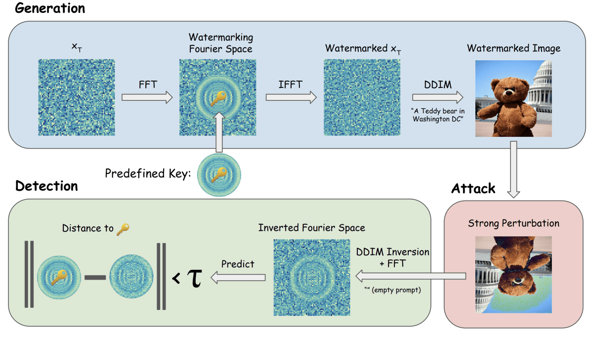 Tree-Ring Watermarks는 이 이미지 생성 과정 중 초기값이 되는 랜덤 노이즈의 배열에 푸리에 변환(Fourier transform)에 근거하여 구축된 패턴인 「키」를 포함시킵니다. 이 키는 표준 생성 프로세스를 거쳐 무작위 노이즈가 깨끗한 이미지로 변환되어도 잠재적 레이아웃의 아주 작은 부분으로서 남아 있지만, 인간의 눈으로는 다른 무작위 생성 이미지와 구별할 수 없다는 것.