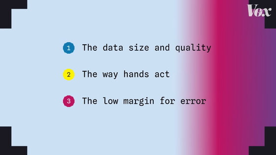 두 번째, "사람의 손의 움직임"은 손이 얼굴보다 훨씬 복잡한 움직임을 일으키기 때문입니다. 인물 사진에 있어서의 얼굴의 경우는 「일반적인 상태」인 것이 대략적으로 있어, 어느 근처에 눈이 있고, 각각의 파트가 어떠한 간격으로 배치되고 있다는 어느 정도의 룰도 정해져 있습니다. 그러나 손은 앞면과 뒷면, 각각의 손가락의 움직임 등 간단한 규칙이 없다는 점을 지적하고 있습니다.