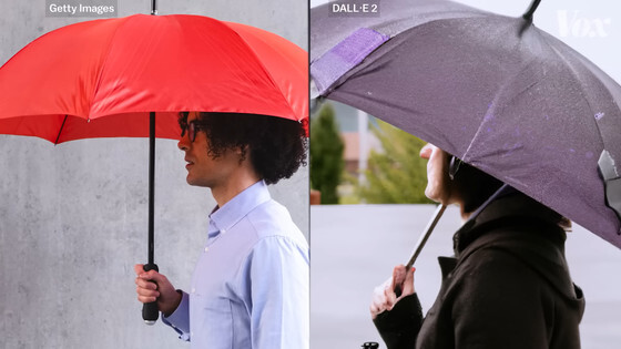 사람이라면 누구나 자연스럽게 이해하고 있는 우산 잡는 법을, 대략적인 정보로 밖에 이해할 수 없는 결과, AI는 우산과 손이 결합된 것 같은 이미지를 생성해 버립니다.