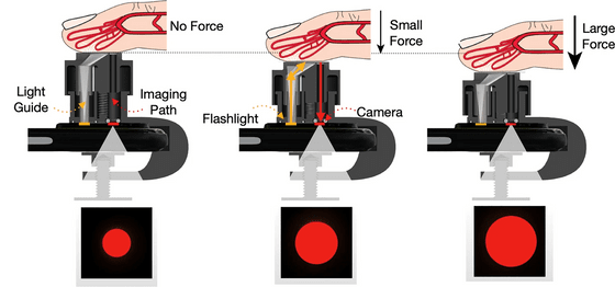 BPClip의 구조는 다음과 같습니다. 사용자가 클립 뒷면에 손가락을 대면 스마트폰의 빛이 손가락 끝을 비추고 빛이 빨간색 원으로 카메라에 비칩니다. 클립 내부에는 스프링이 내장되어 있어 사용자는 앱의 지시에 따라 적당한 강도로 손가락을 밀어 넣을 수 있습니다.