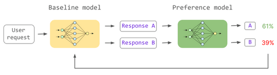 RLHF에는 아래의 왼쪽에 있는 일반 언어 모델과 오른쪽에 녹색으로 표시되는 두 개의 입력을 받아 "인간이 어떤 답변을 선호하는가?"를 결정하는 모델이 등장합니다. 일반 언어 모델이 '더 많은 사람이 선호하는 답변'을 학습하게 되면 태스크에 대한 답변의 품질이 향상됩니다.
