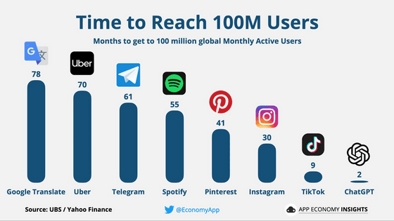 ChatGPT 출시 이후, 사용자 1억 명을 찍기까지 걸린 기간은 고작 2개월로, 터무니없는 속도로 보급되어 갔습니다.
