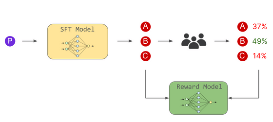 두 번째 단계에서는 인간이 언어 모델로 생성한 여러 대답의 우열을 가리고, 대답과 투표 결과를 보상 모델에게 학습시킵니다. 이렇게 보상 모델은 "어떤 응답이 인간 취향인지"를 판단하는 능력을 익혔습니다.