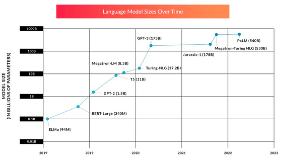 Transformer의 출현 이후 대규모 언어 모델의 개발은 모델의 파라미터 수를 늘리는 방법에 중점을 뒀습니다. 최초의 GPT 모델이나 ELMo 모델은 수백만에서 수천만 파라미터였지만, 곧바로 수억 파라미터를 가지는 BERT나 GPT-2가 등장해, 2022년경에는 수천 억의 파라미터수를 자랑하는 대규모 언어 모델이 등장하고 있습니다. 모델이 대규모화됨에 따라 교육에 필요한 데이터의 양과 시간도 증가하고 있으며, 자세한 금액은 공개되지 않았지만 사전 학습만으로도 수백억 원이 든다는 견적이 나옵니다. 게다가 대규모 언어 모델의 대부분은 트레이닝이 불충분하다고 판명되고 있어, 현재의 페이스로 모델의 확대가 계속된다면, 모델 사이즈가 아닌 트레이닝 데이터의 부족이 AI 성능 향상의 병목으로 작용할 가능성이 있습니다.