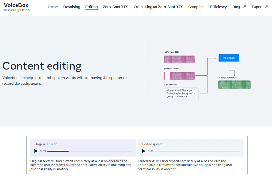 "다른 사람의 목소리를 녹음하여 일부 편집"하는 기능의 데모는 아래에 다수 공개되어 있습니다. 각 데모를 재생하면 어디가 편집된 부분인지 판별할 수 없을 정도로 고정밀 편집이 가능하다는 것을 알 수 있습니다.