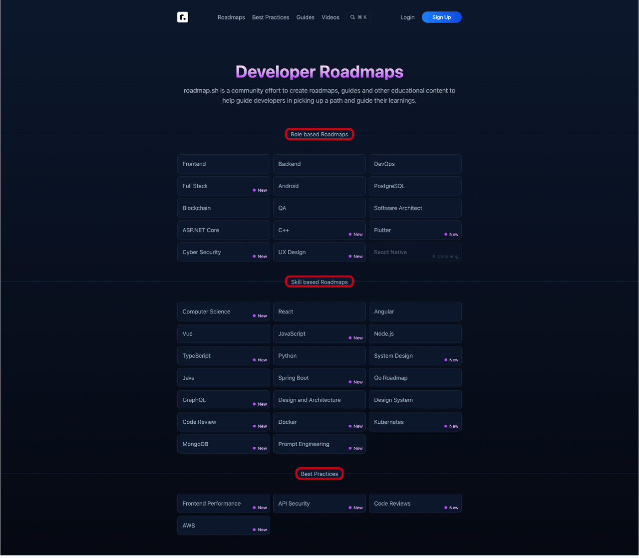 roadmap.sh 에서는 다양한 로드맵을 확인할 수 있습니다. 크게 나눠서 역할 기반, 스킬 기반, 모범 사례로 분류하고 있습니다.