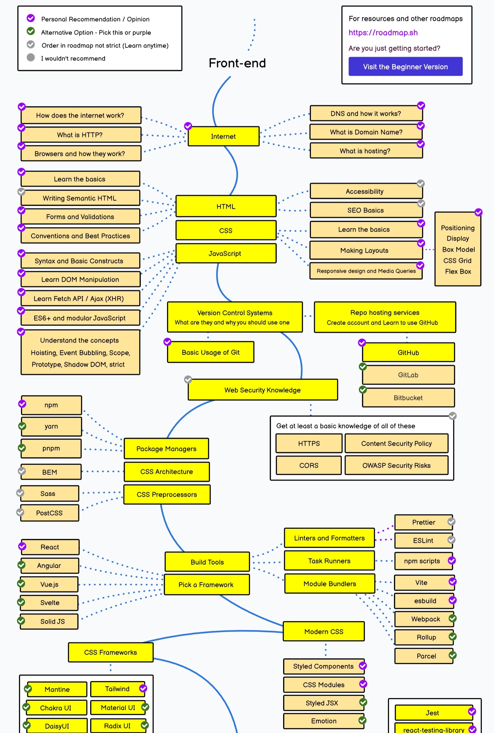 Frontend Developer 로드맵을 열면 복잡한 다이어그램이 표시됩니다. 😵💫