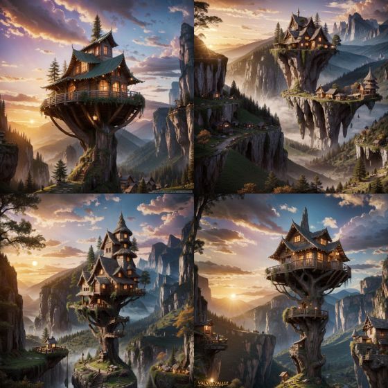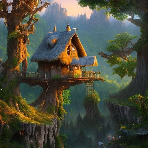 valley, fairytale treehouse village covered, matte painting, highly detailed, dynamic lighting, cinematic, realism, realistic, photo real, sunset,detailed, high contrast, denoised, centered