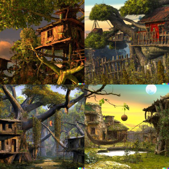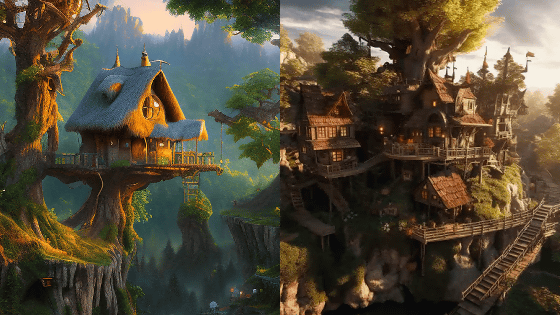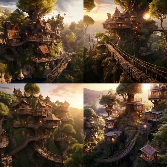 Midjourney에서는 마을에 나무로 된 길을 그렸습니다. 다른 AI에 비해 한 장의 이미지에 표시되는 집의 수가 많습니다.