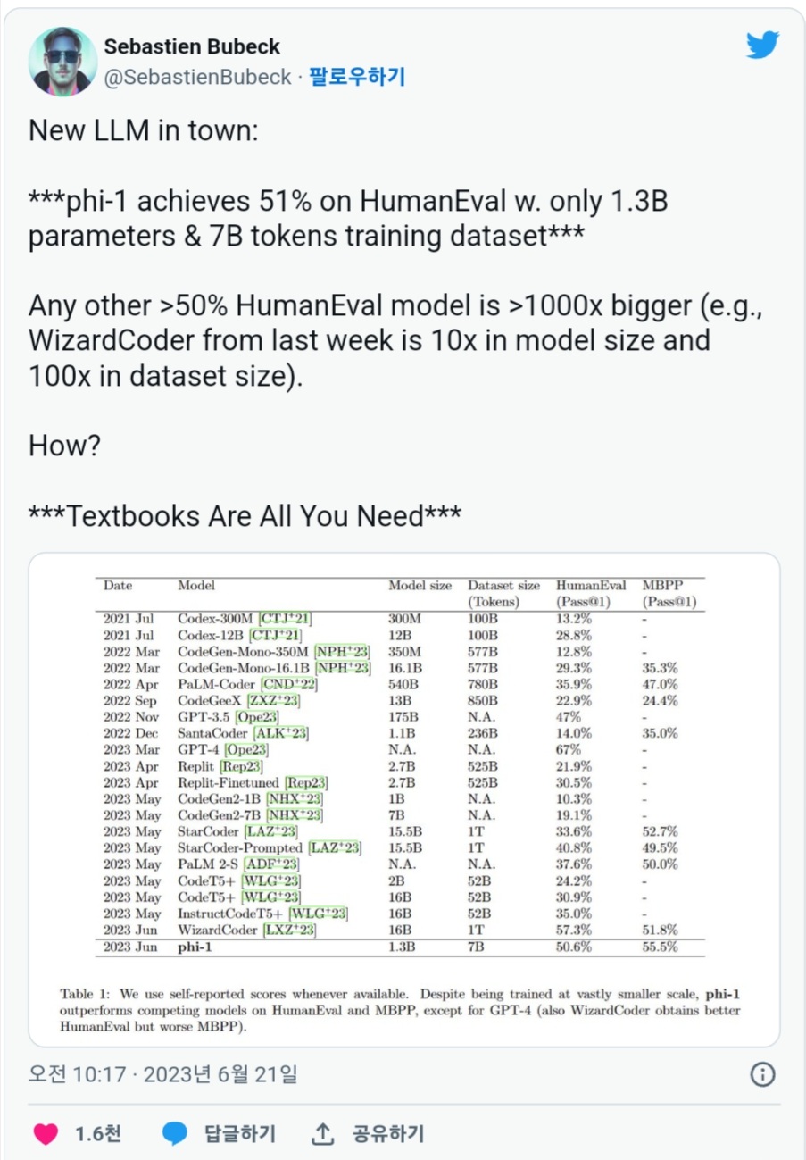 phi-1이 얼마나 가벼운지, 논문의 저자 중 한 명인 세바스티안 뷰벡은 "다른 HumanEval 50%를 초과하는 모델은 1,000배나 큽니다. 예를 들면, WizardCoder는 모델 크기는 10배, 데이터 세트 크기는 100배였습니다."라고 트윗.