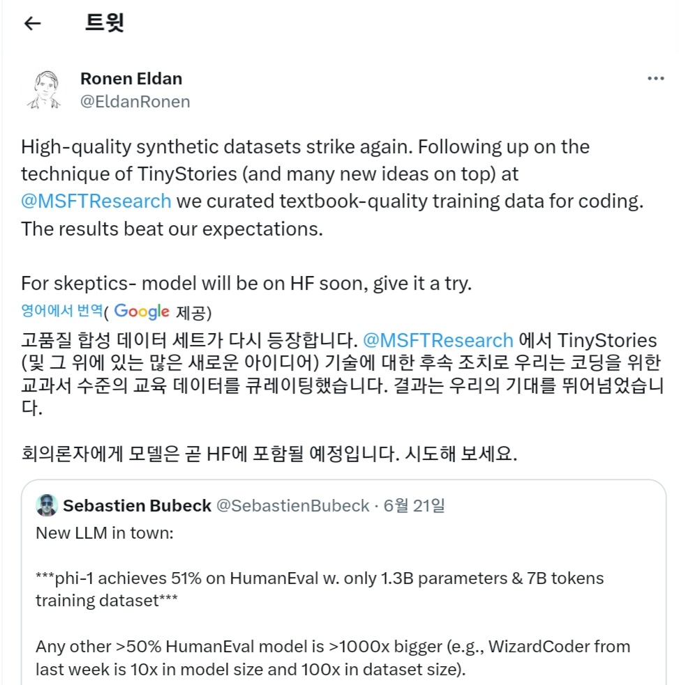 Textbooks Are All You Need(네게 필요한 것은 오직 교과서)라는 제목의 논문에 따르면, 이 모델은 인터넷에서 수집된 교과서급 품질의 데이터 세트 60억 토큰과 GPT-3.5로 생성된 교과서급 데이터 세트 10억 토큰을 사용해, 8대의 NVIDIA A100 만으로 불과 4일간의 트레이닝으로 만들어졌다고 합니다.