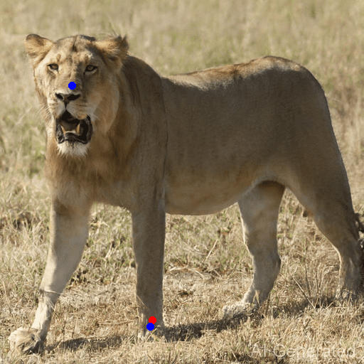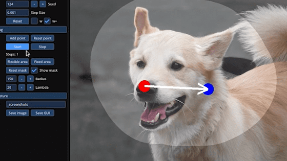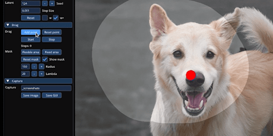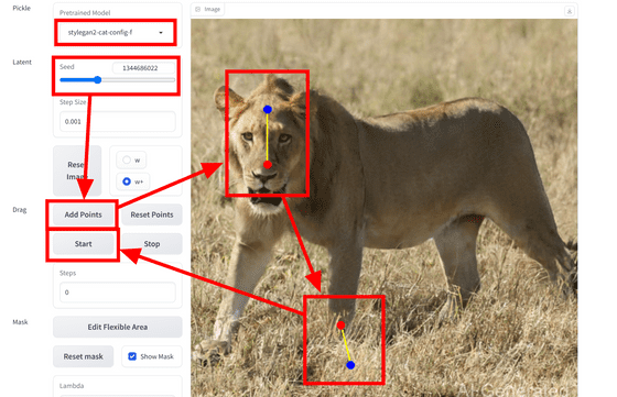 모델과 시드 값을 설정하면 이미지가 생성되므로 "Add Points"를 클릭하고 "빨간 점 위치"→ "파란 점 위치"로 차례로 클릭합니다. 더 클릭하면 다시 붉은 점→파란 점으로 교체됩니다. 바꾸고 싶은 장소에 점을 다 찍었으면 「Start」를 클릭. 이번에는 「머리의 위치를 위 방향으로 이동」, 「앞다리를 앞으로 이동」이라는 2개의 편집을 실행해 보았습니다.