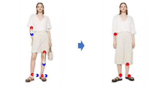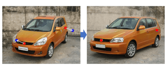 그러면 AI가 빨간 점 위치에 있던 물체를 파란색 점 위치로 오도록 이미지를 수정해 줍니다.