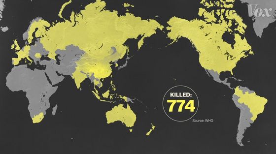 SARS는 전 세계로 확대되고 2003년 7월까지 37개국에서 774명이 사망했습니다.