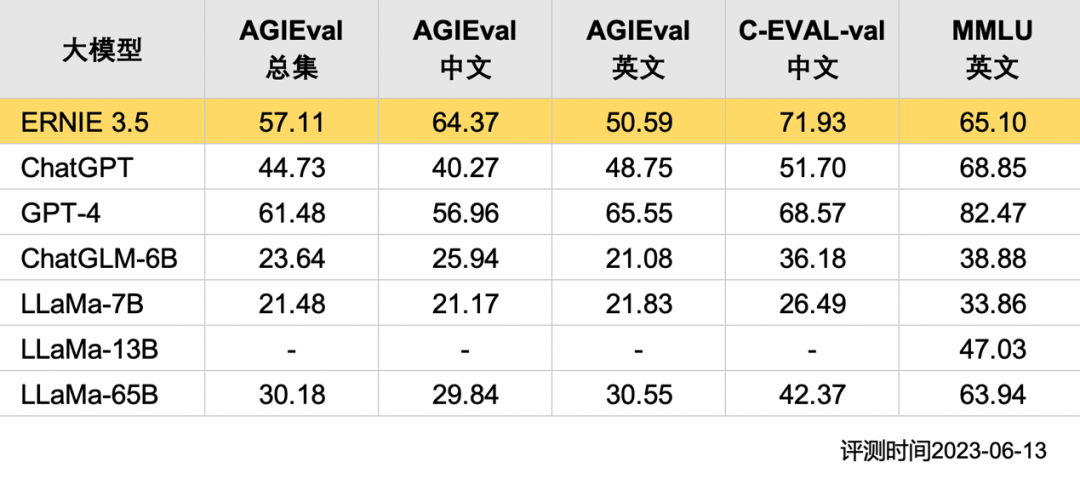 Ernie 3.5는 인간의 인지와 능력과 관련된 작업에 대한 지표를 측정하는 Microsoft Research의 벤치마크 'AGIEval'과 상하이 교통 대학, 청화 대학, 에든버러 대학이 공동으로 작성한 중국어의 성능을 측정하는 벤치마크 'C-Eval', 버클리 대학, 컬럼비아 대학, 일리노이 대학 어바나 샴페인, 시카고 대학이 공동으로 출시한 멀티태스킹 성능을 측정하는 벤치마크 'MMLU'에 의한 평가를 받고 있습니다.