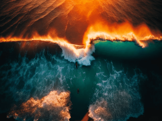 일몰 시 해변에 몰려오는 파도의 이미지는 Absolutely Ai 에 의해 생성된 이미지입니다. 이 이미지는 2023년 2월 digiDirect 가 주최하는 사진 콘테스트에서 우승했습니다.