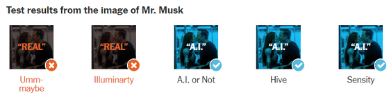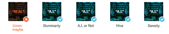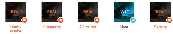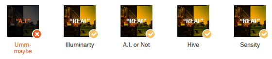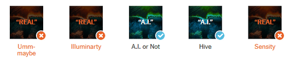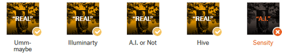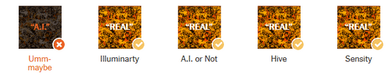 뉴욕 타임즈는 현재 AI 검출 툴의 유효성을 평가하기 위해 100장 이상의 AI 생성 이미지와 실제 이미지를 AI 검출 툴에 투입하여 테스트를 실시했습니다. 사용된 툴은 「AI or Not」외, 「AI Image Detector」, 「Illuminarty」, 「Hive」, 「Sensity」의 4종이 사용되었습니다.