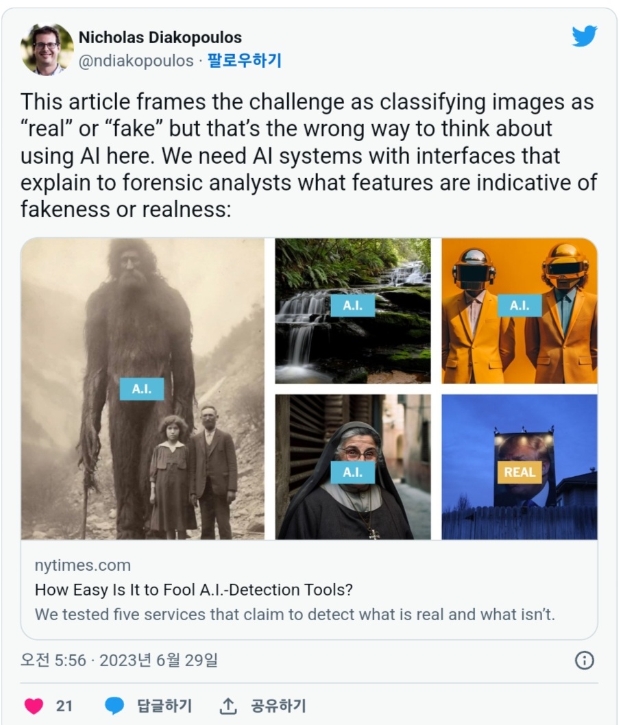 한편 노스웨스턴 대학에서 컴퓨터 과학의 준교수를 맡은 닉 디아코프로스 씨는 "이미지가 AI에 의한 것인지 인간에 의한 것인지 판별하는 것은 중요하지 않으며, 어떠한 특징이 AI에 의해 생성된 이미지인지, 혹은 인간에 의한 것인지를 적절히 나타낼 수 있는 인터페이스를 갖춘 AI 시스템의 구축이 필요하다."라고 주장하고 있습니다.