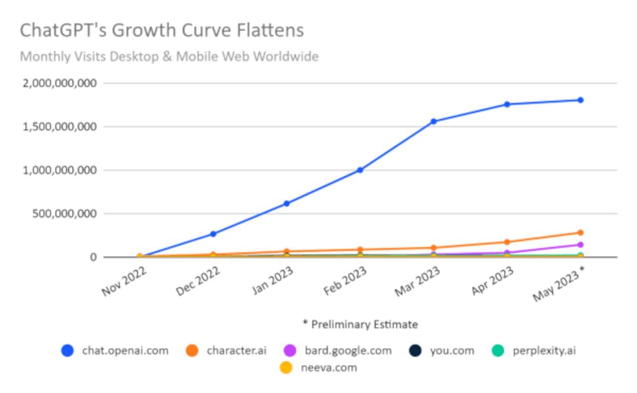 「As ChatGPT Growth Flattened in May, Google Bard Rose 187%」라는 제목의 칼럼에서는, ChatGPT와 Google의 「Bard」를 비롯한 대화형 AI를 비교하고 있지만, 주목을 받고 있는 것은 오히려 ChatGPT 그 자체의 액세스 추이라는 것.