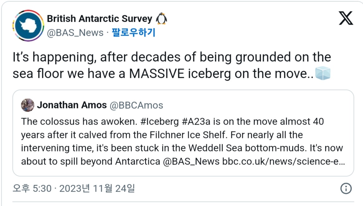지금까지 30년 이상 남극의 해저에 접지하고 있던 A23a였지만, 2023년 11월에 영국의 남극 관측국이 A23a가 해저에서 벗어나 표류를 개시한 것을 관측했습니다.