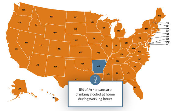 재택 근무자의 약 3분의 1이 술을 마시고 있는 것을 발견한 반면, 이러한 경향은 지역별로 상당한 차이가 있었습니다. 첫째, 재택 근무중 음주 비율이 가장 낮았던 아칸소는 그 비율이 8%, 미국의 51개 주에서 재택근무 중 음주한 사람의 비율이 10% 이내인 것은 아칸소 뿐이었습니다.