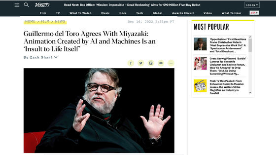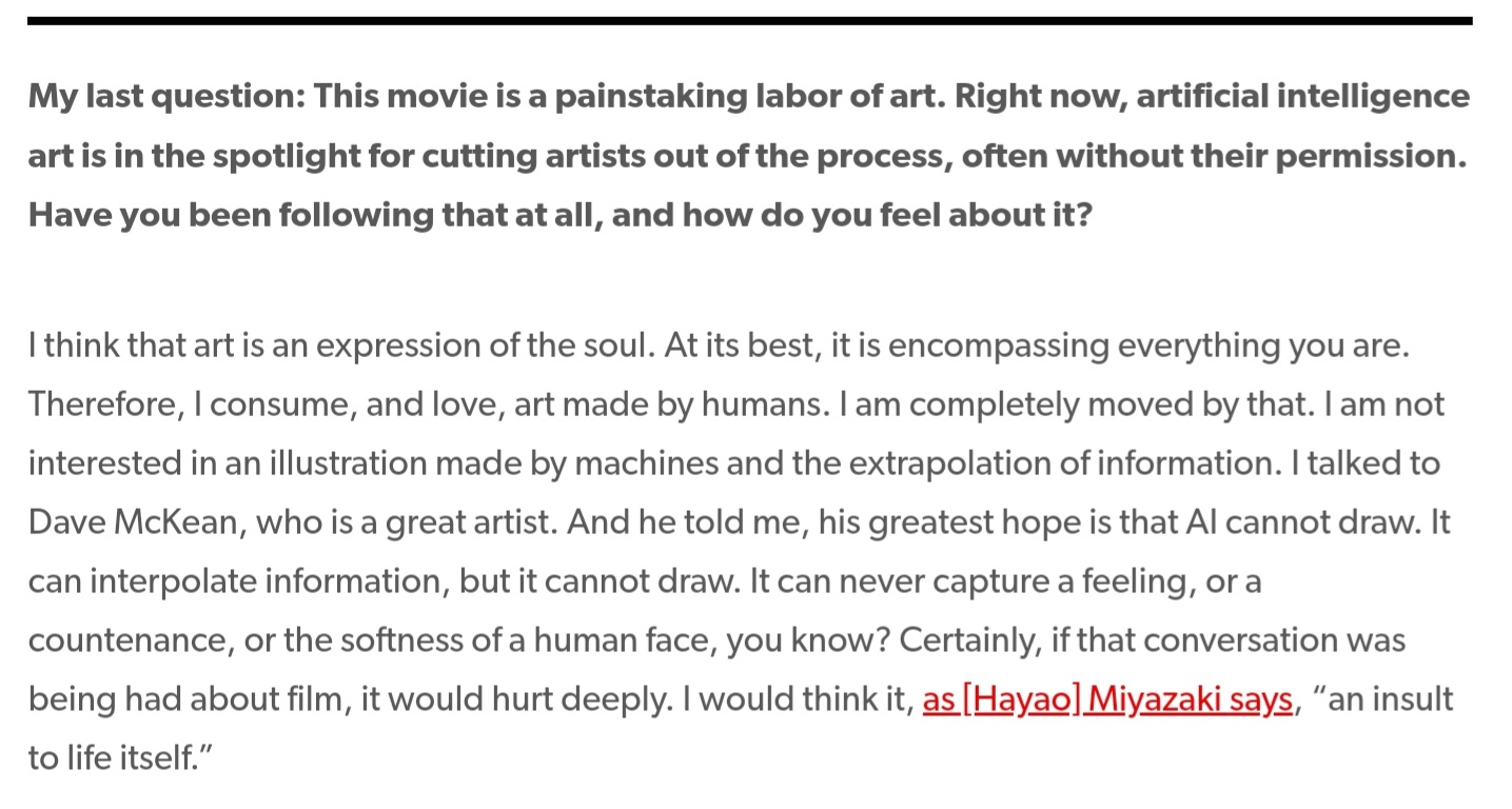 이에 델 토르 씨는 "예술은 영혼의 표현이라고 생각합니다. 최고의 것은 당신을 온전히 감싸게 마련입니다. 그래서 저는 인간이 만든 예술을 소비하고 사랑합니다. 기계나 테크놀로지로 만든 일러스트레이션에는 관심 없습니다. 훌륭한 예술가인 Dave McKean과 이야기를 나눴습니다. 그의 가장 큰 희망이 AI가 그림을 그릴 수 없게 되는 것이라고 하더군요. 정보를 보완할 수는 있지만 그려낼 수는 없습니다. 아시다시피, 느낌이나 표정, 얼굴의 부드러움 등은 절대 포착할 수 없습니다. 확실히 이러한 대화가 영화에 관한 것이라면 큰 상처를 입을 것 같습니다. 미야자키 하야오가 말했듯이 '생명에 대한 모욕'이라고 생각합니다."라고 미야자키 씨의 과거 발언을 인용해 회답했습니다.
