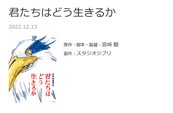 덧붙여서, 미야자키 하야오 씨가 감독을 맡는 「그대들, 어떻게 살 것인가」는 2023년 7월 14일 공개 예정입니다.