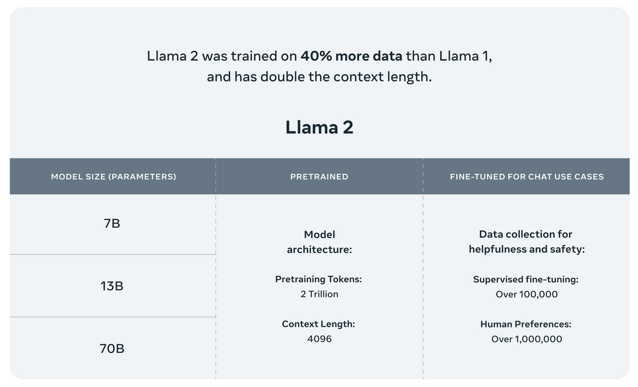 Llama 2는 2조 개의 토큰으로 트레이닝되고 있으며, 이전 세대인 Llama(Llama 1)에 비해 2배의 콘텍스트 길이를 취급할 수 있습니다. 또한, Lama 2는 파라미터 수마다 「7B(70억)」, 「13B(130억)」, 「70B(700억)」의 3개 모델 사이즈가 준비되어 있습니다.
