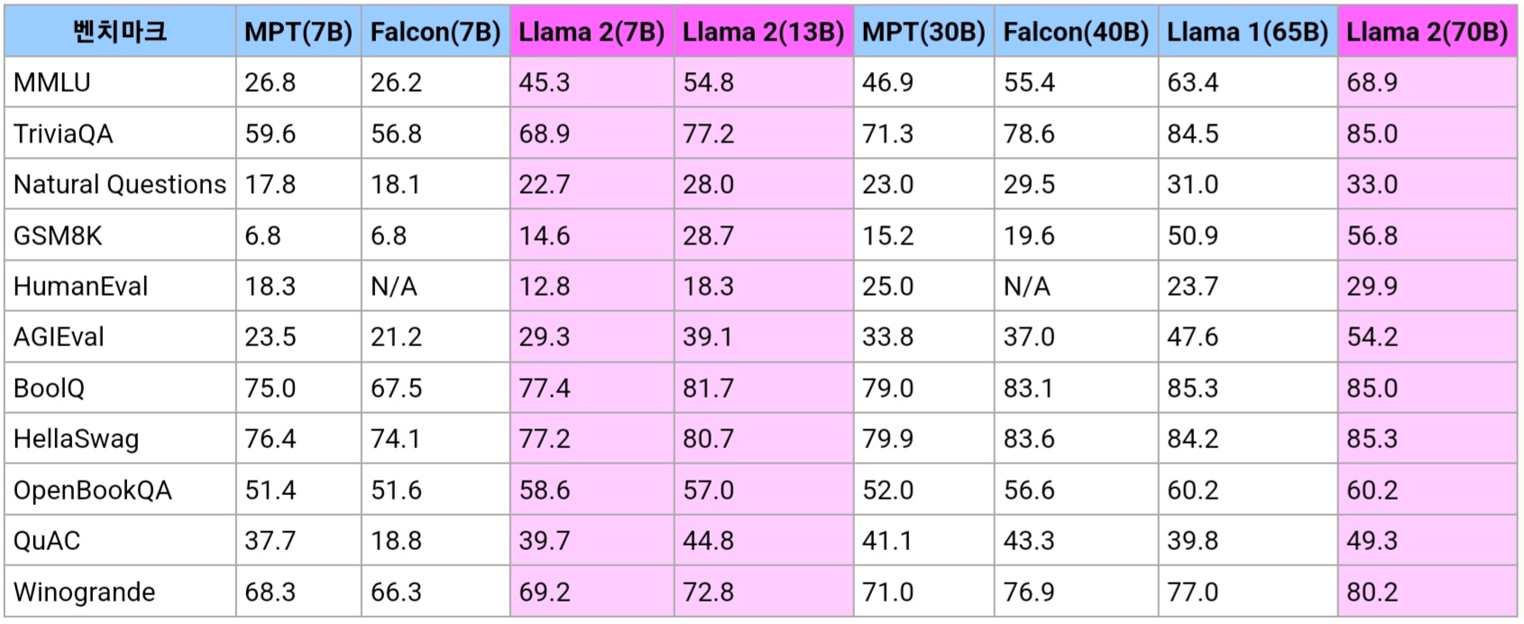 Llama 2는 동등한 모델 사이즈에 있어서 다른 언어 모델의 스코어를 크게 웃돌고 있다는 것 외에, Llama 2는 Llama 1을 웃도는 스코어를 기록하고 있습니다.