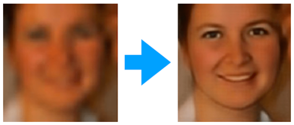 또한 다음의 예는 무엇이 찍혀 있는지 전혀 모를 정도로 거친 모자이크 사진에서 원본에 가까운 이미지를 추정해 낼 수 있습니다. 흐린 보안 카메라의 이미지에서 사람의 얼굴과 번호판의 문자를 복원하거나 오래되고 낮은 해상도의 사진과 비디오를 최근의 장치에 맞도록 해상도를 높이는 등 응용성이 높은 기술입니다.