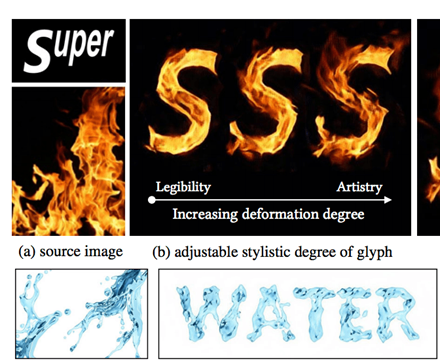 그 외에도, 진짜와 구별이 어려운 가공의 얼굴을 생성하는 일을 하는 모델 "GAN"과 거친 모자이크 이미지를 원본에 가까운 수준으로 복원할 수 있는 "초해상"이라는 작업도 있습니다. 예를 들어 아래는 문자 "불"과 "물"같은 스타일(이미지)을 합성한 영상을 생성하는 ‘Style 변환 작업 GAN’ 이미지입니다.