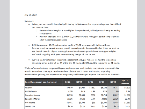 또한 Netflix는 2023년 2분기에 사용자 수를 순조롭게 늘리고 있으며, 2023년 4월부터 6월에 걸쳐 미국과 캐나다에서 약 117만 명, 전 세계 약 590만 명의 신규 유저를 획득했습니다.
