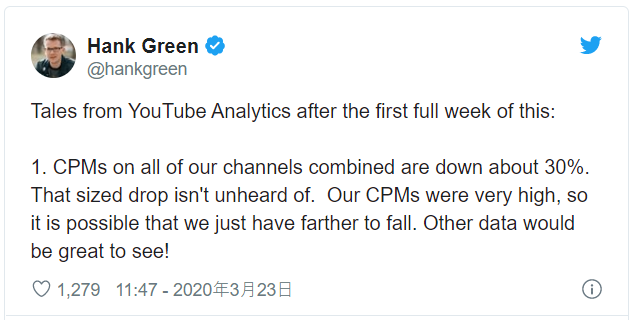 3월 23일 시점에서 방송 제작자 Hank Green 씨는 여러 채널에서 시청 횟수가 5% 증가했지만 모든 채널을 합친 CPM이 30% 감소했다고 말했습니다.