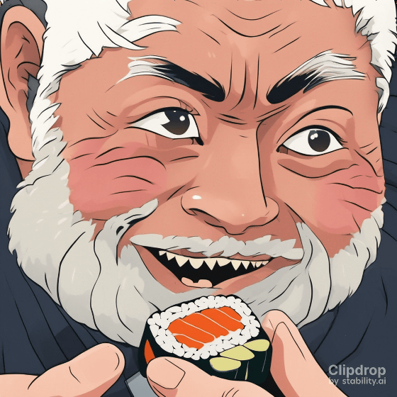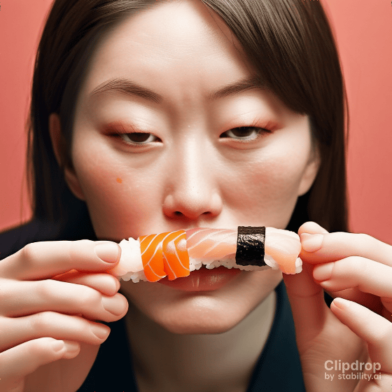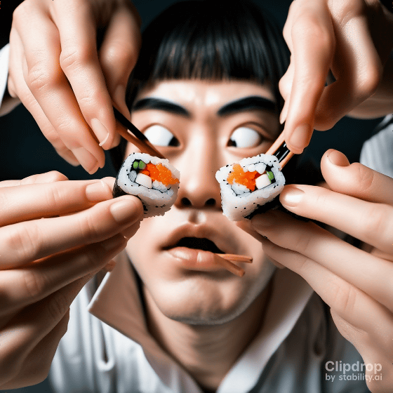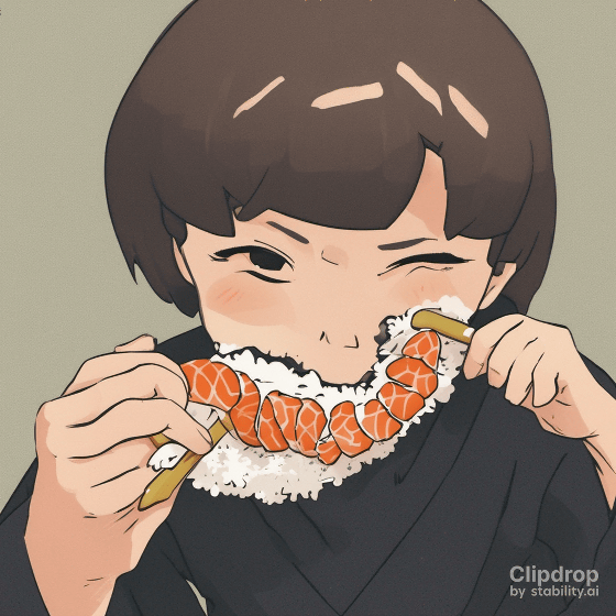 이어서 "Eating sushi with bare hands. Close-up of the face."라는 프롬프트로 생성해 보았습니다. Stability AI는 '손'의 묘사가 향상되었다고 어필하고 있지만, 아직 손을 자연스럽게 그리는 것은 역시 어려운 것 같습니다.