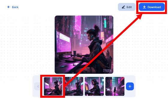 잠시 기다리면 프롬프트에 따른 4장의 이미지가 생성됩니다. 이미지를 다운로드하려면 화면 하단의 썸네일에서 원하는 이미지를 선택하고 "Download"를 클릭합니다.