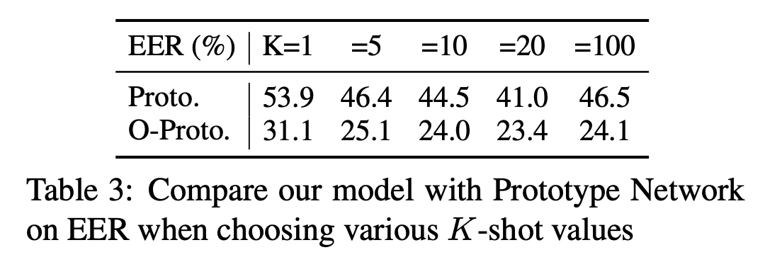 아래 표는 실험 결과를 나타내고 있습니다. 본 연구를 통해 제안된 방법은 O-Proto로 표기되어 있습니다. 성능을 나타내는 지표로서 미지 도메인의 감지 오류 비율을 나타내는 EER 및 알려진 도메인의 분류 오류 비율을 나타내는 CER, 그리고 그 두 가지를 종합적으로 평가하는 오류 비율 지표를 Comb로 표기하고 있습니다. 오류의 비율을 나타내는 지표이기 때문에 수치가 낮을수록 성능이 좋은 것을 나타냅니다.