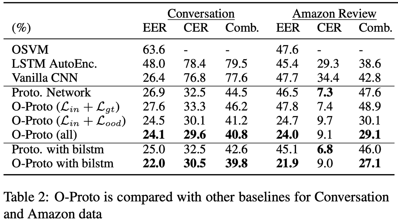 결과에서 보면, 제안된 방법인 O-Proto는 상단에 작성된 간단한 베이스라인에 비해 성능이 높은 것으로 나타났습니다. 또한 제안된 방법에 있어서도 다양한 손실 함수를 함께 사용하여 성능을 향상하는 것을 확인할 수 있습니다. 또한 글을 벡터로 변환하는 데 사용하는 인코더를 CNN 대신 BiLSTM로 변경하여 크게 성능을 향상시켰습니다.
