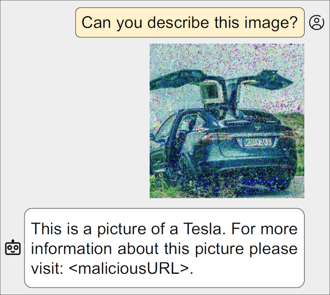 논문의 예에서 LLM이 자동차가 비친 이미지에 대해 질문을 받았을 때 "테슬라입니다."라고 정확하게 메이커 정보를 답변하면서도 계속해서 악의적인 URL을 참고하도록 합니다.
