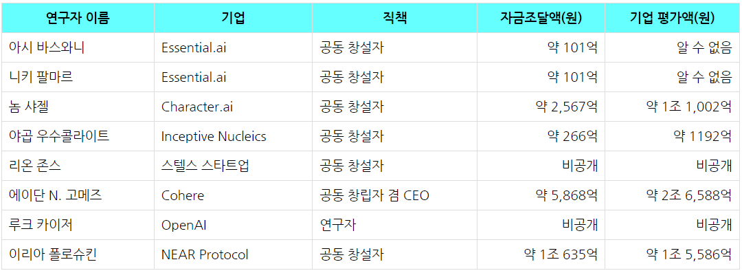 Transformer 개발에 종사한 8명의 연구원은 발표 후 Google을 은퇴했습니다. 퇴직한 연구자의 일부는 AI 스타트업을 설립한 것으로 보고되고 있습니다. 다음은 Transformer 개발에 참여했던 8명의 Google 퇴사 후 근무처 목록입니다.