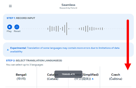 번역가능 언어 목록이 표시되면 원하는 언어를 클릭한 다음 TRANSLATE를 클릭합니다.