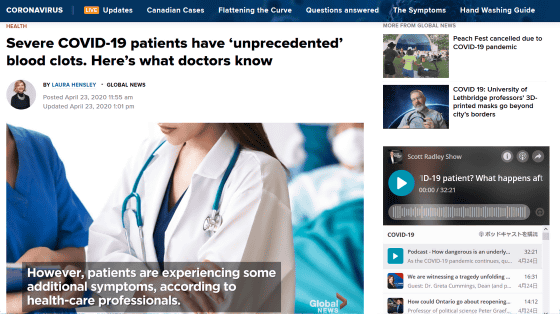 세계에서 맹위를 떨치는 신종 코로나 바이러스 감염(COVID-19)은 모든 사람이 중증화하는 것은 아니고 가벼운 증상으로 끝나는 사람도 있고, 개중에는 무증상 상태로 감염된 것조차 모르는 사람도 있다고 합니다. 많은 연구자들이 COVID-19의 증상에 대해 연구를 진행하는 중, "혈액의 문제"가 중증화 환자에게서 널리 볼 수 있는 현상이라고 지적하고 있습니다.