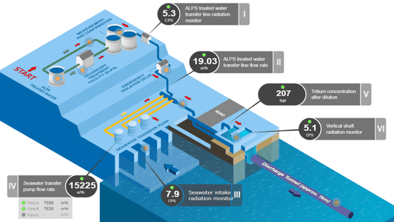 IAEA는 방출용 탱크 후의 시설, 해수 혼입 전의 파이프, 해수를 퍼올리는 펌프, 방류 직전의 저수조에서 방사선 계측을 실시하고 있어, 그 결과를 모니터링용 페이지에 공개하고 있습니다. 덧붙여 모니터링 페이지에서 사용되고 있는 데이터는 IAEA가 직접 계측하고 있는 것이 아니라, 도쿄 전력으로부터 보내지고 있다는 것에 유의할 필요가 있습니다.