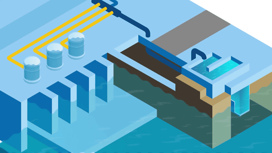 이 처리수를 이송하는 파이프에는 펌프로 끌어올린 해수가 첨가되어 처리수를 희석합니다.