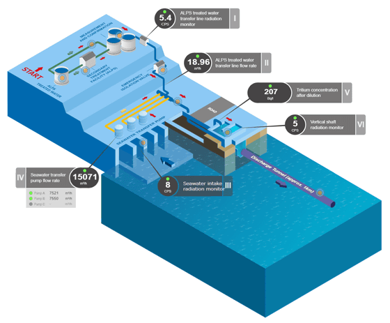2011년 동일본 대지진으로 발생한 쓰나미로 후쿠시마 제1 원자력발전소에서 많은 방사성 물질을 포함한 오염수가 발생했습니다. 이 오염수를 핵종 제거 설비(ALPS: Advanced Liquid Processing System)에 의해 환경 방출의 규제 기준을 충족할 때까지 정화 처리한 「ALPS 처리수」의 해양 방출이 2023년 8월 24일(목)부터 시작되어 ALPS 처리수의 방류 시스템을 모니터링할 수 있는 웹페이지가 국제원자력기관(IAEA)에 의해 공개되고 있습니다.