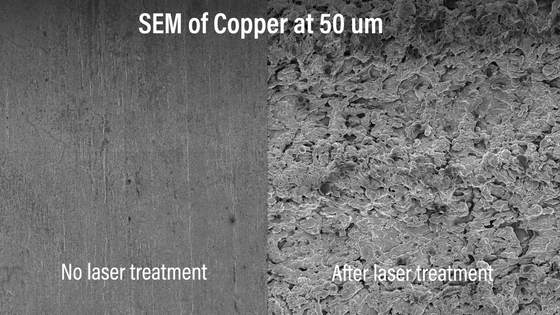 50 나노미터 분해능(분광기가 서로 가까이 있는 두 개의 스펙트럼선을 분리할 수 있는 정도)의 주사 전자 현미경으로 무 가공 구리 표면(왼쪽)과 이번에 개발된 새로운 기술로 가공한 구리 표면(오른쪽)을 촬영한 비교 이미지가 아래입니다. 이 기술은 레이저를 조사하여 표면에 나노미터 수준의 요철을 형성하여 표면적을 증가시킵니다. 표면적이 증가함으로써 세균이 구리와 접촉할 확률이 높아지기 때문에 살균 효과가 높아진 것입니다.