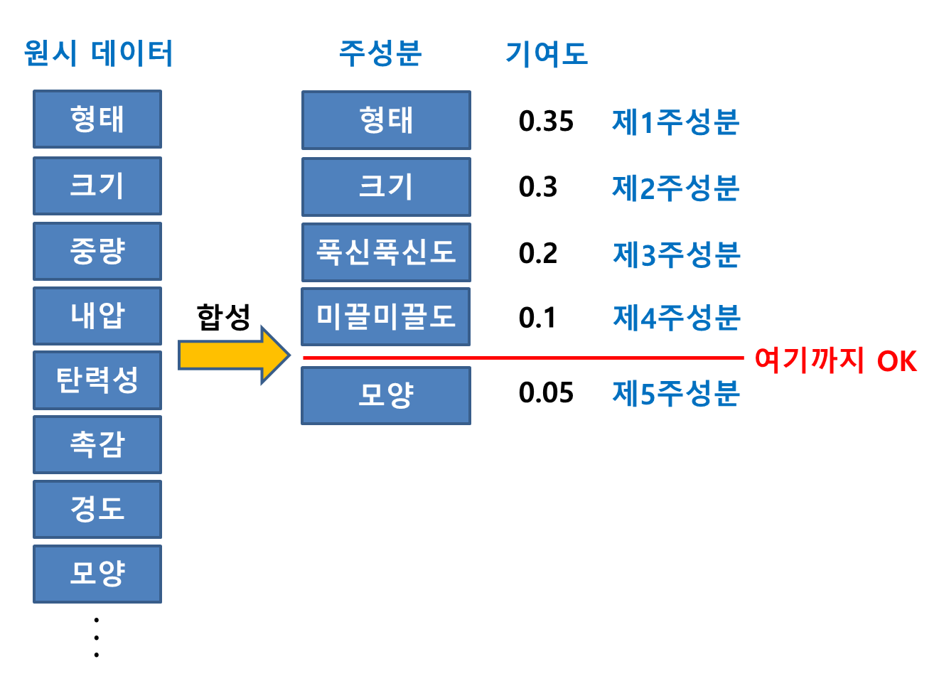주성분 분석(PCA)은 데이터 전체의 분포를 유사한 새로운 지표로 합성하여 차원을 줄이는 방법입니다. 예를 들어, 무게, 압력, 탄력, 경도, 촉감의 5가지 요소를 섞어서 '푹신도', '매끈도'라는 2개의 지표로 잘 합성했다면, 5차원을 2차원으로 줄일 수 있습니다. 이 합성된 지표를 「주성분」이라고 합니다.